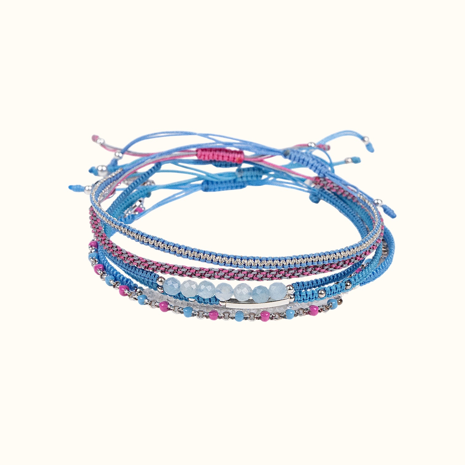 Сет плетёных браслетов "Blue Bay" (Голубой Залив) – это прохладное прикосновение летнего бриза. Розовые и голубые нити сплетаются в мелодию, рассказывающую о тихих рассветах на берегу моря, о ласковых волнах, играющих с песком, и о мечтах, устремленных в бесконечную даль.