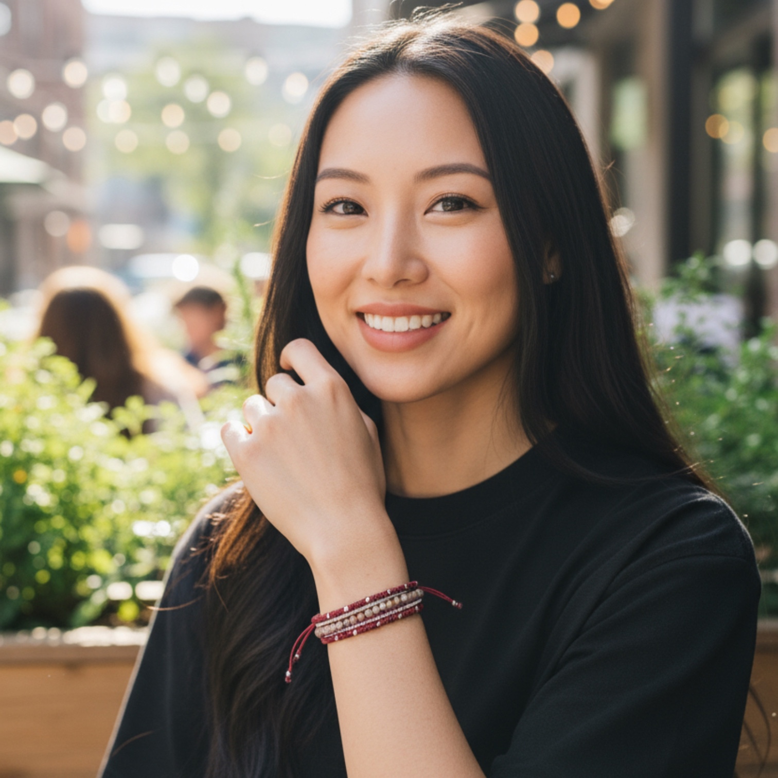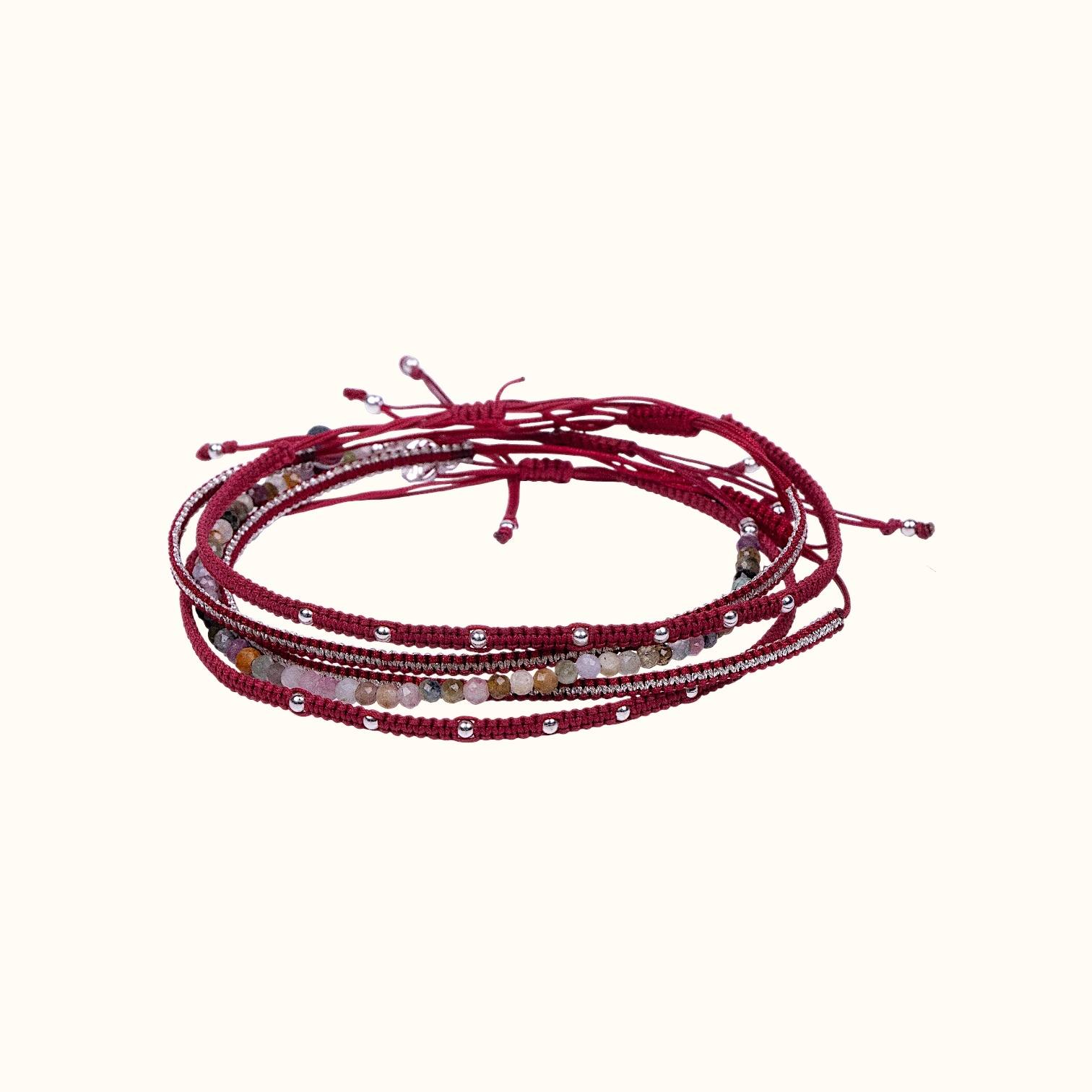 Сет плетеных браслетов Scarlet Morning (Багряное утро) - вдохновлён красотой утреннего неба и первыми лучами солнца. Бордовые нити переплетаются в узоры, напоминающие о рассвете, когда мир пробуждается и наполняется жизнью. Это обещание нового дня, наполненного светом, надеждой и возможностью начать всё заново.