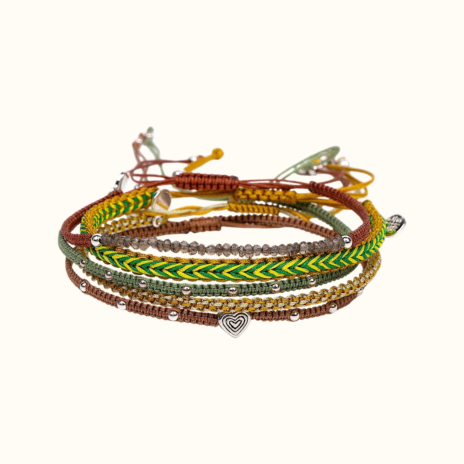 Сет из 5 плетеных браслетов в оливково-коричневых оттенках.