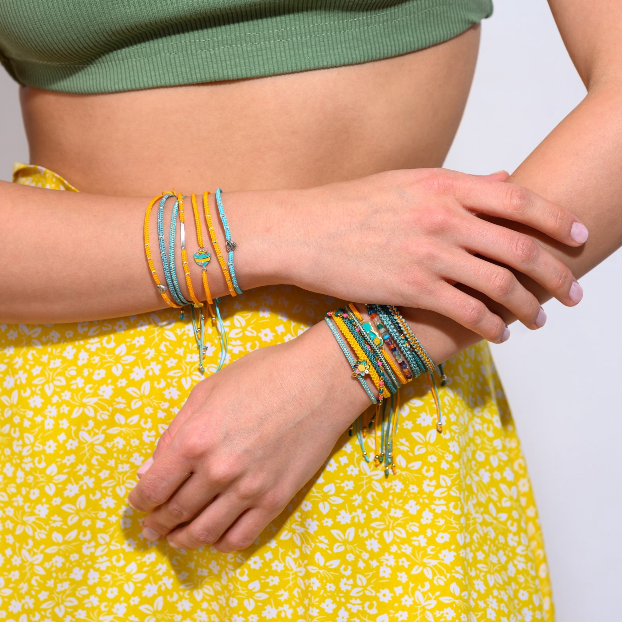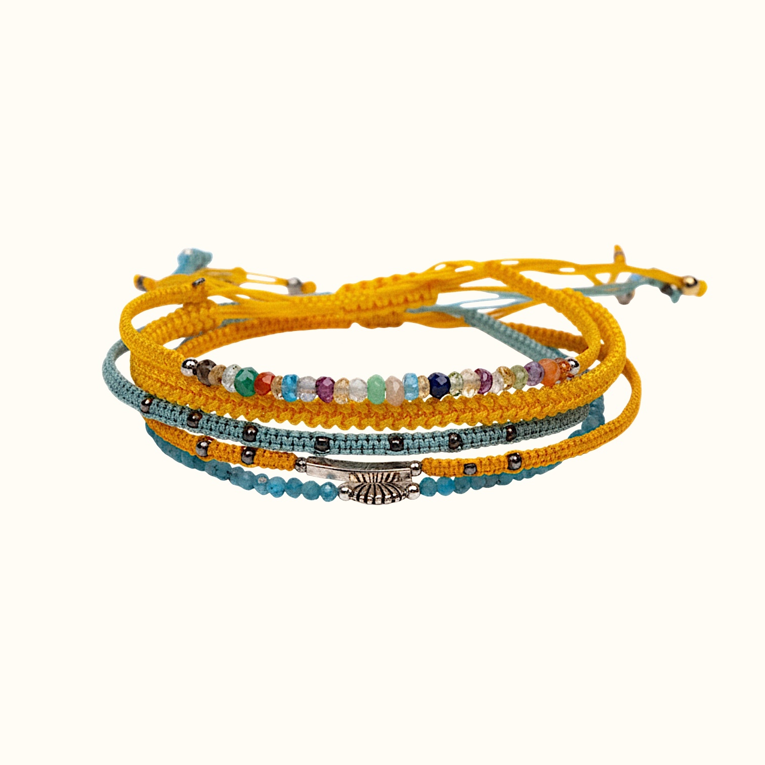 Сет плетёных браслетов "Samui" (Самуи) - это атмосфера безмятежного отдыха на тропическом острове. Яркое сочетание жёлтого и бирюзового словно напоминает о ласковом солнце, кристально чистом море и о беспечных днях, проведенных на пляже. Позвольте этим браслетам перенести вас в мир, где царит бесконечное лето.