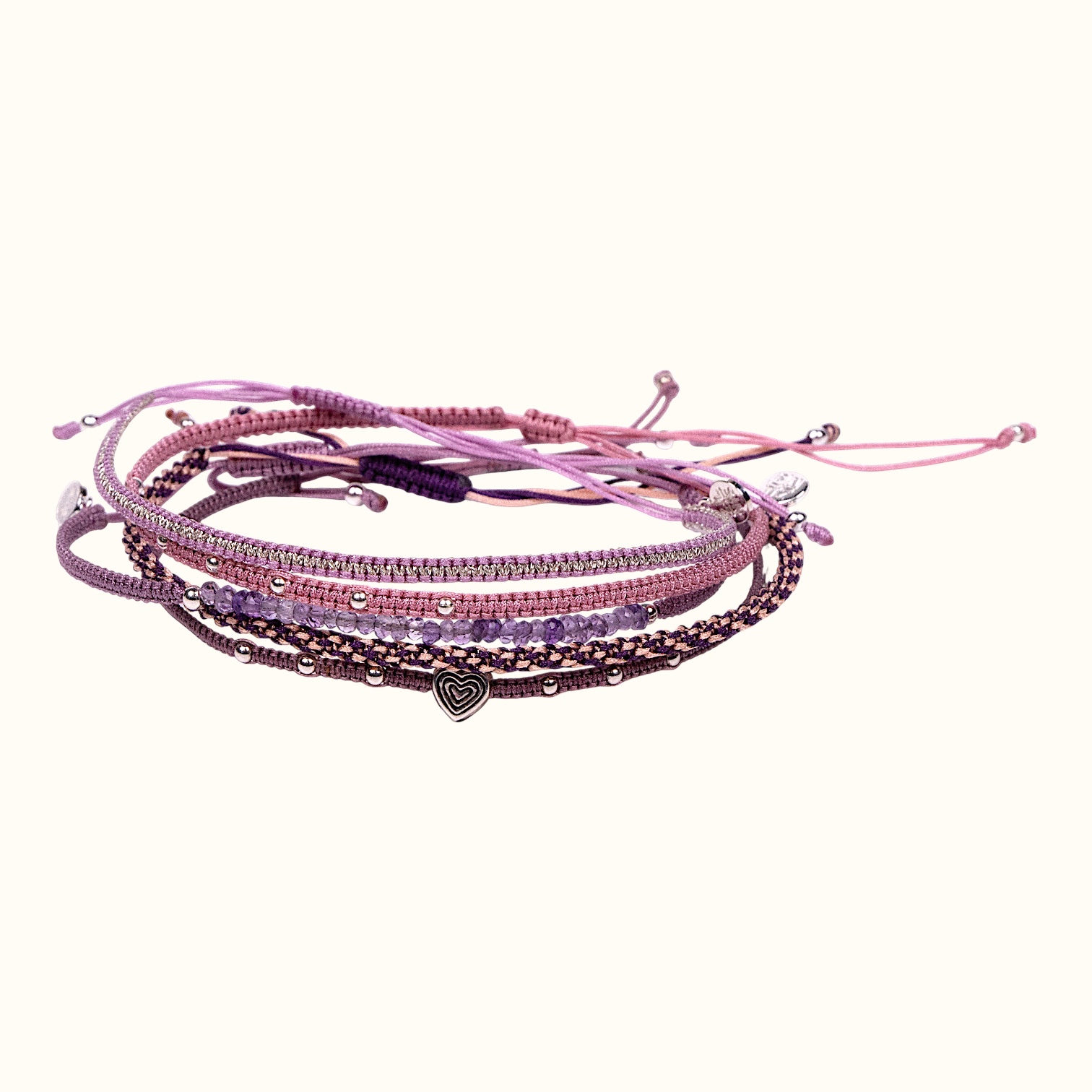 Сет из 5 плетеных регулируемых браслетов в розово-сиреневых оттенках.