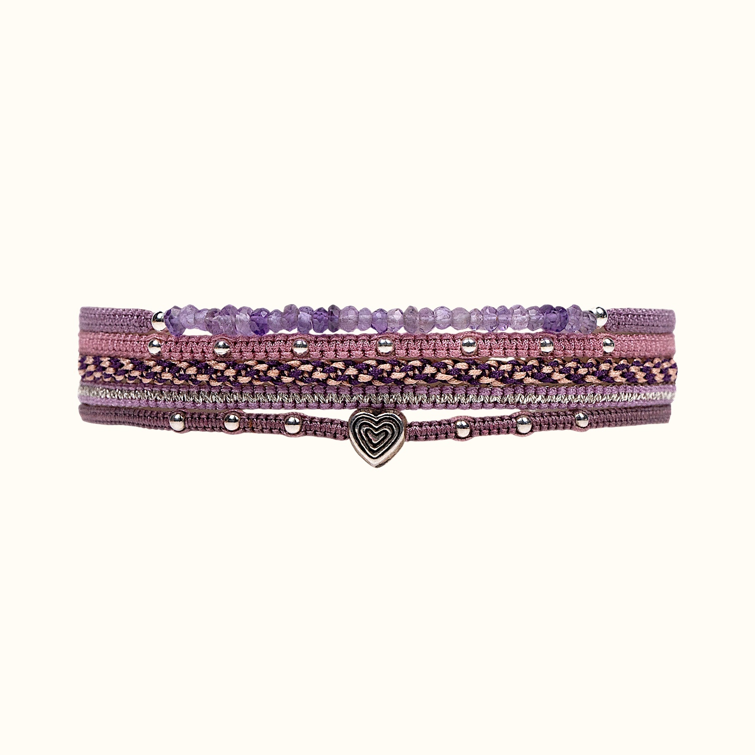 • Плетеный узкий браслет розово-сиреневый  с натуральным Аметистом