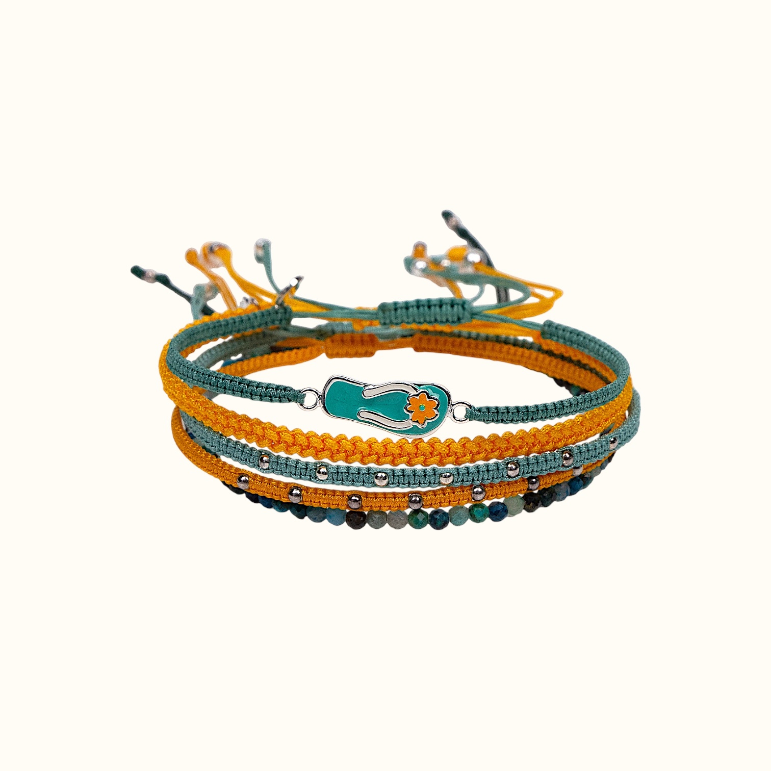 Сет плетеных браслетов "Ibiza"(Ибица) – это воспоминание о днях, наполненных солнцем, морским бризом и громкой музыкой. Желто-бирюзовая палитра, словно закат, сливающийся с морем, отражает яркие впечатления и незабываемые моменты, а flip-flop– символ свободы, которую можно почувствовать только на этом волшебном острове. Почувствуй пульс Ибицы, перенесясь в мир, где царит вечное лето и нет места для грусти.