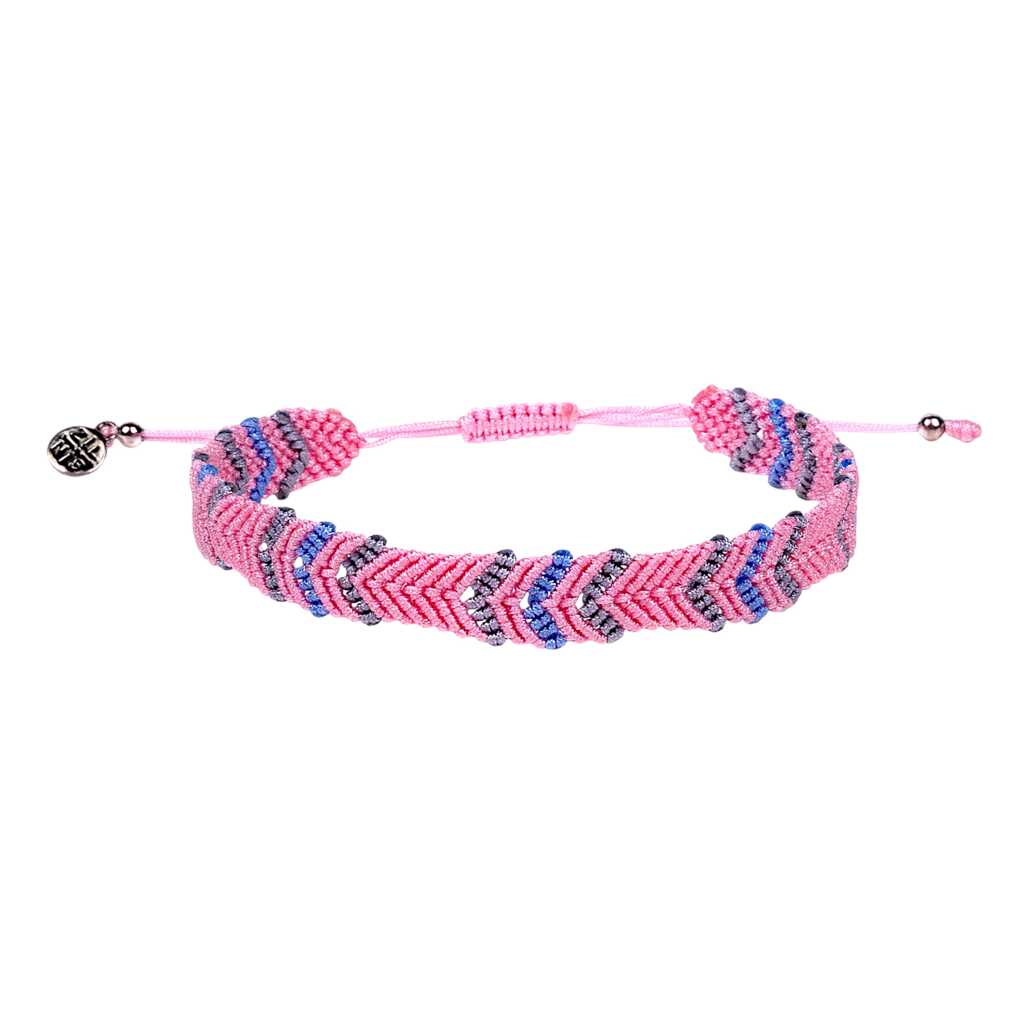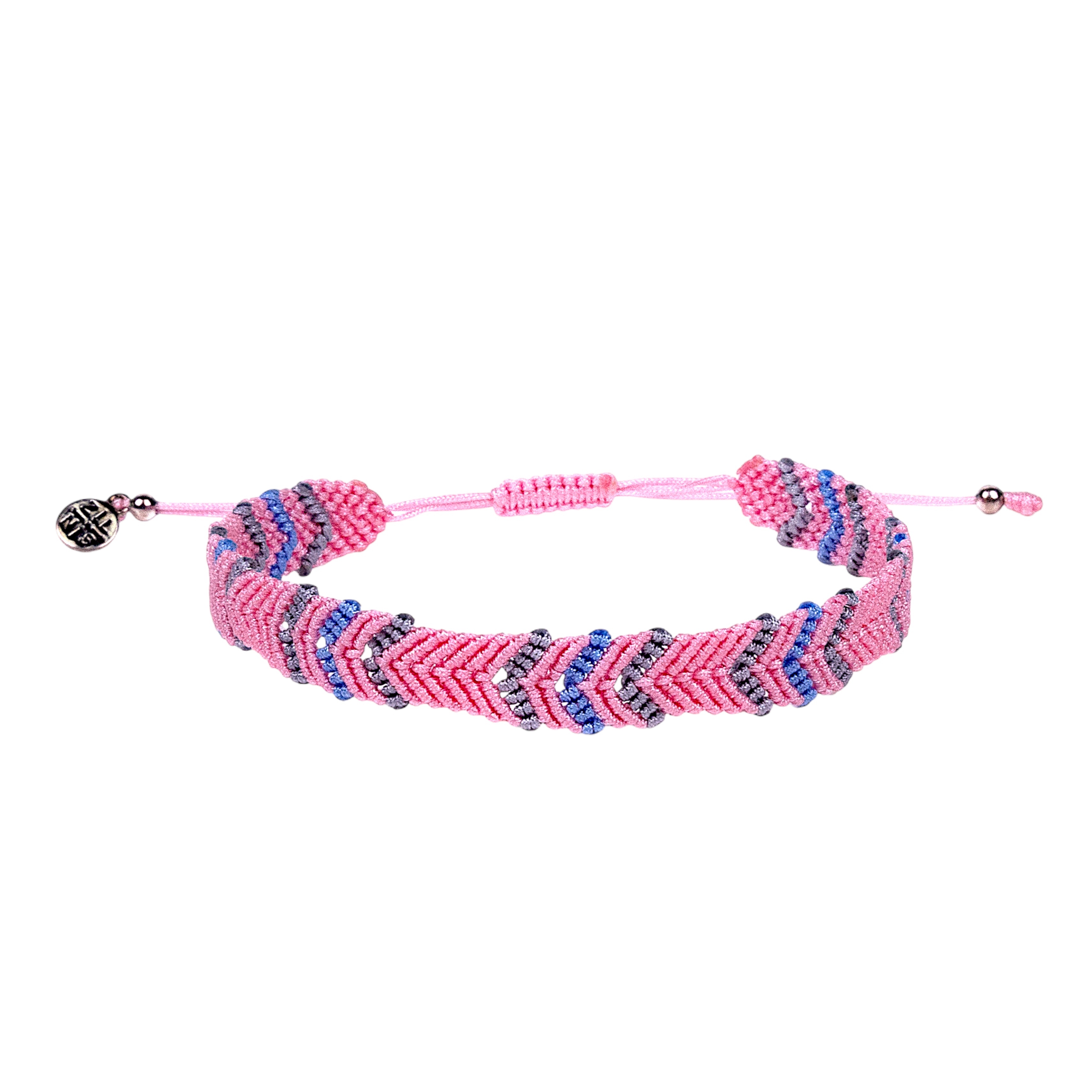 Сет из 5 плетеных браслетов в лазурно-розовых оттенках.